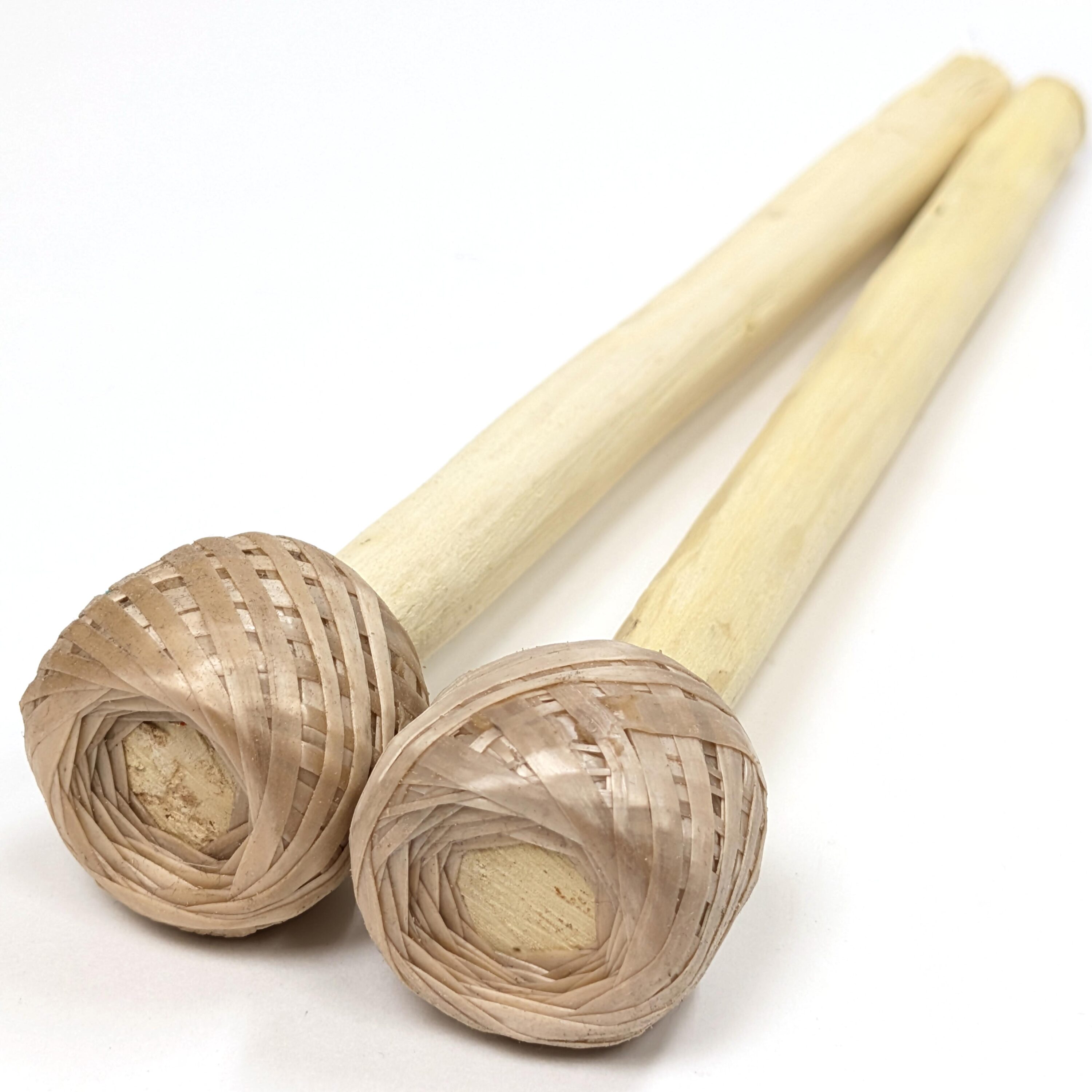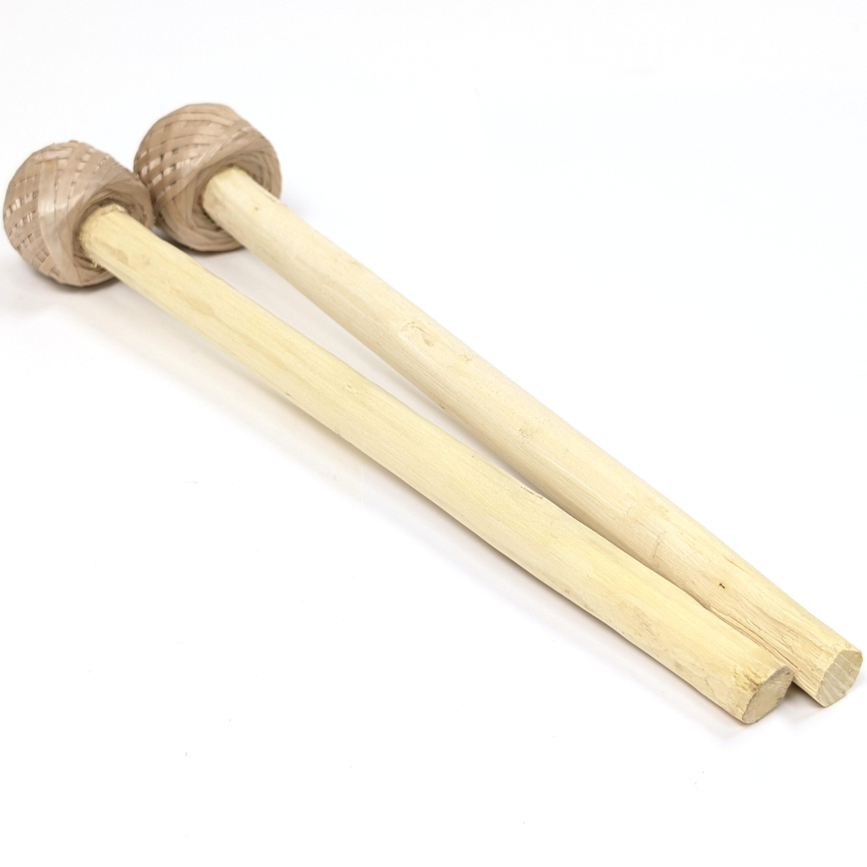 手で彫りだしたスティックにギニア産天然ゴムを幾重にもヘッドに巻いた伝統に忠実な作りです。